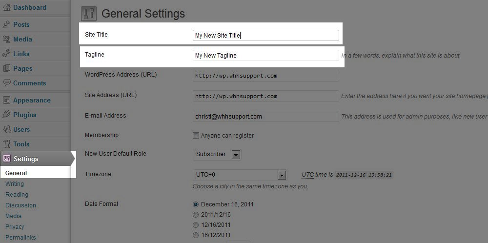At the top of the screen you will see the Site Title and Tagline fields where you can type in your new Site Title and/or Tagline.