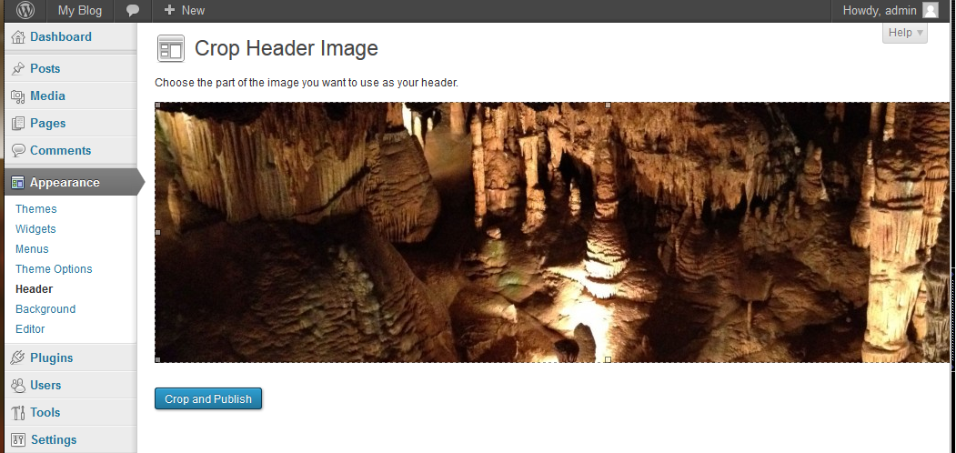 When you have selected the image, you will see the option to CROP AND PUBLISH. Crop the image as necessary, then click on the button CROP AND PUBLISH to proceed.This completes the modification of the header graphic. Click on VISIT SITE in the top menu bar in order to see the website with the changed header.