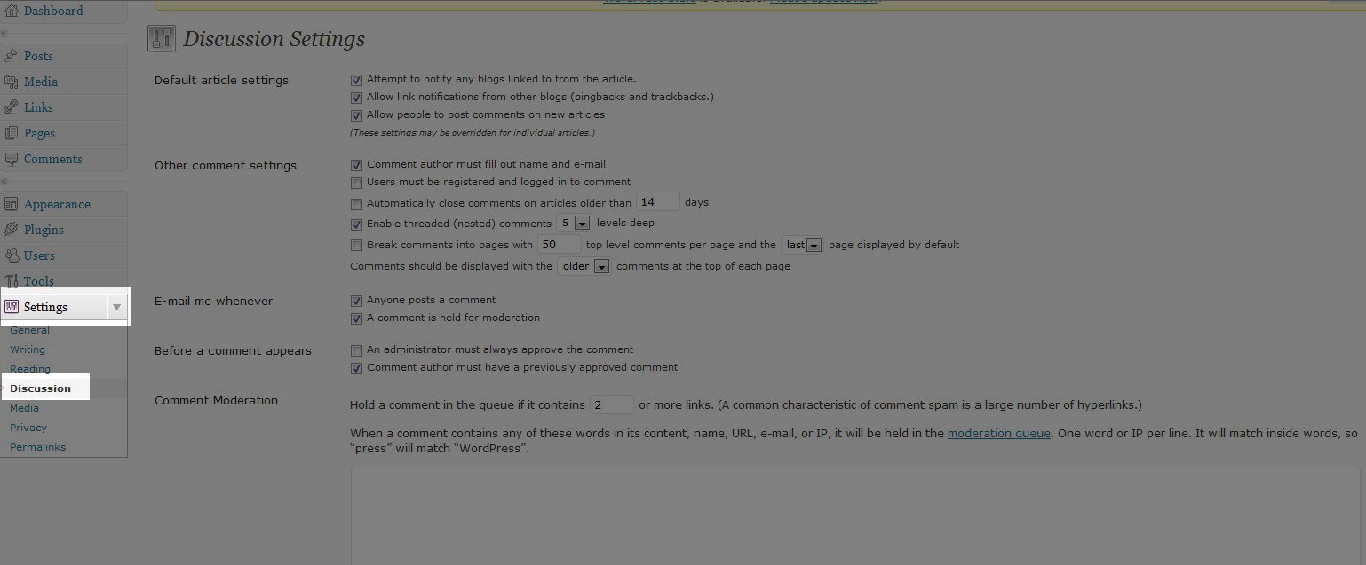 The Comments option allows visitors to your website to respond to each individual blog post. To set up how comments are managed on your website, first log into your WordPress Dashboard. Once logged in, click on "Settings" in the left menu and then "Discussion" to bring up the window to manage your comments: