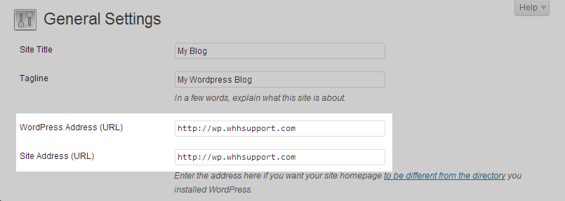 This will bring up the General Settings page. Locate the WordPress Address (URL) and Site Address (URL)fields. These are the ones you will enter your new domain name into.