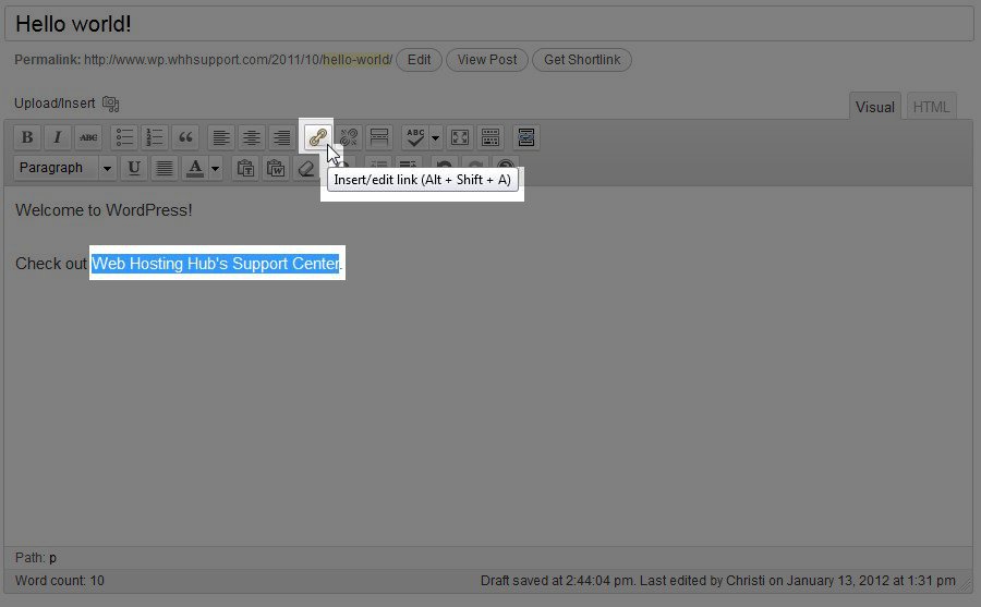Adding links in a WordPress Post or Page is fairly easy. There are a few different steps to take depending on whether you are inserting an internal link (link to another part of your own site) or external link (link to a different site).