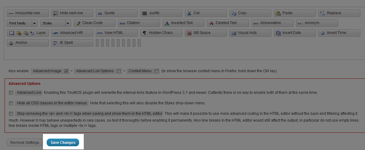 To add the table tools to your editor, click and drag the table tools to one of the additional toolbar areas and click the Save Changes button at the bottom of the page.