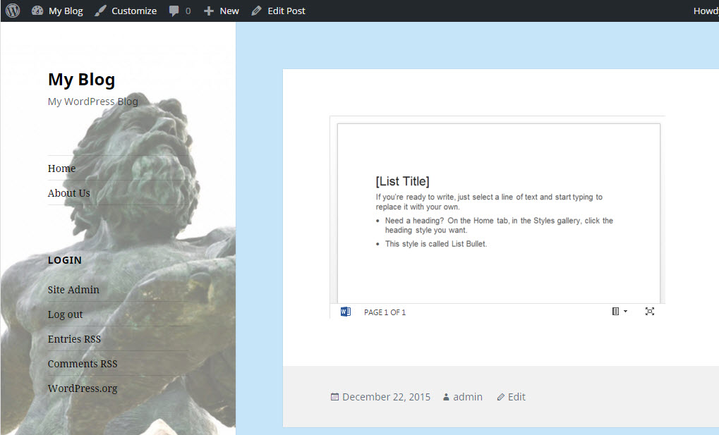One of the most common applications that people use are the Microsoft Office applications that include Excel and Word. Happily, if you don't have these applications, you can still obtain a free account in Outlook.com. Then through Microsoft's One Drive, you can obtain documents from others using Microsoft Office and then obtain a link that you can use to share the document or embed in a website. For this tutorial we will be embedding a Word document into a WordPress post. No plugins needed!