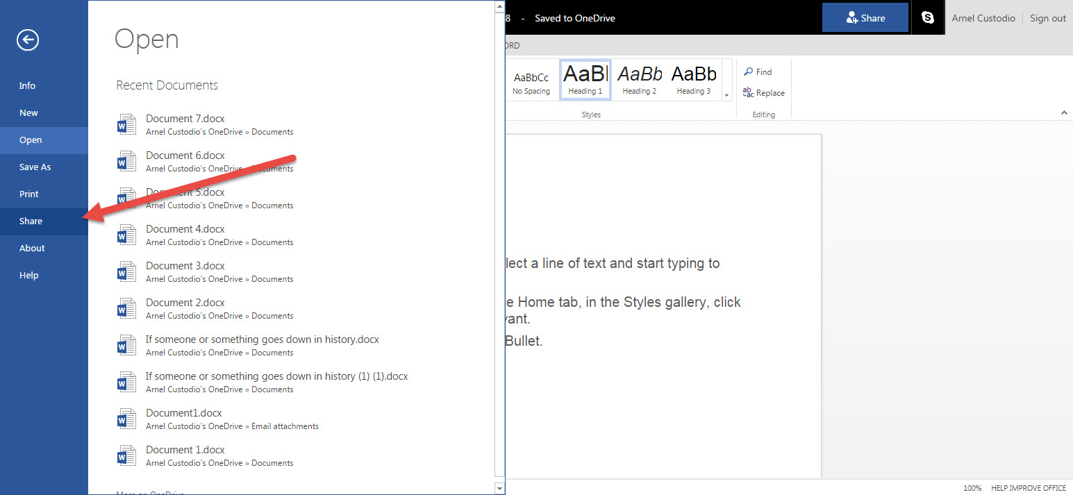 Once you have the document open, you will see a menu across the top. Click on File to open. Next, click on Share