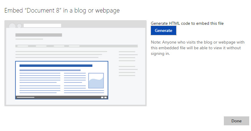 Next you will get a screen that has a Generate button at right. This page basically warns you that people will be able to view your document without having to sign in. Click on Generate to see the HTML code that is used to embed the document. If you want to cancel, then click on Done in the bottom right-hand side of the screen.