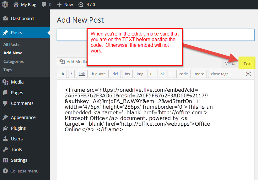 In the editor, make sure that you are on the Text tab, then paste in the embed code that you copied from Microsoft.
