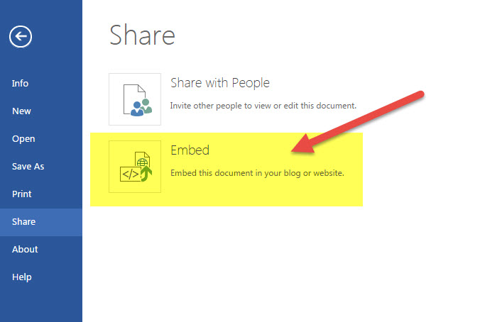 Here you will have the option to Share with People or Embed. Since we are embedding the document into the WordPress post, click on Embed.