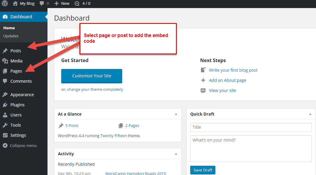 Click on Posts or Pages, then open a new post/page or edit an existing one.