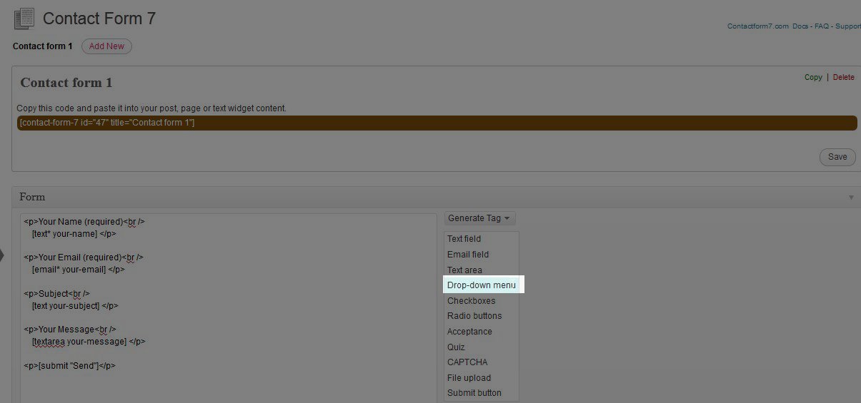 In this example, we'll add a new field to our form ad an example, a drop down menu for users to choose from. This is just an example of one of the available fields in Contact Form 7. If you would like to learn more about the different fields available, please see the Contact Form 7 Documentation.