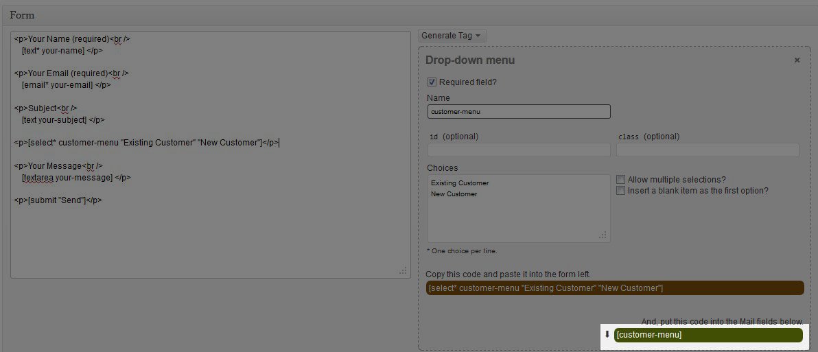 When you have completed the options for your drop down menu, copy the short code and paste it into your form on the left side of the page. The order of the fields is the order they will be on the page. You'll also want to surround the code with opening and closing paragraph tags (<p> and </p>) if you would like it to be on a new line in the form.