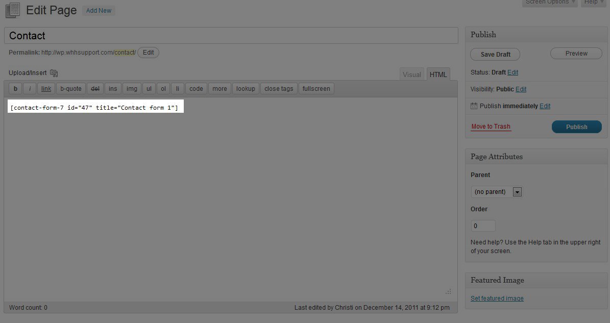 Create a new page to insert your form into. We're naming ours Contact but you can name it anything you like (e.g. Contact, Contact Us, etc.). Paste the form shortcode into your new page and publish your new page.