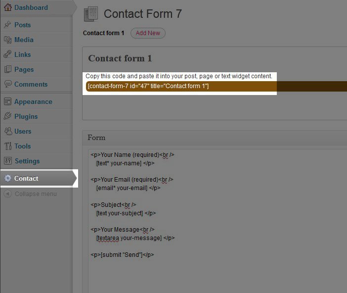 Once you have installed and activated Contact Form 7, click on "Contact" in your WordPress dashboard menu. This will open up the Contact Form 7 settings where you’ll see a default form named “Contact form 1?, and a shortcode. This shortcode is used to display your contact form in a Page (or even a Post). Copy this short code so we can paste it into our new Contact page which we'll create next.