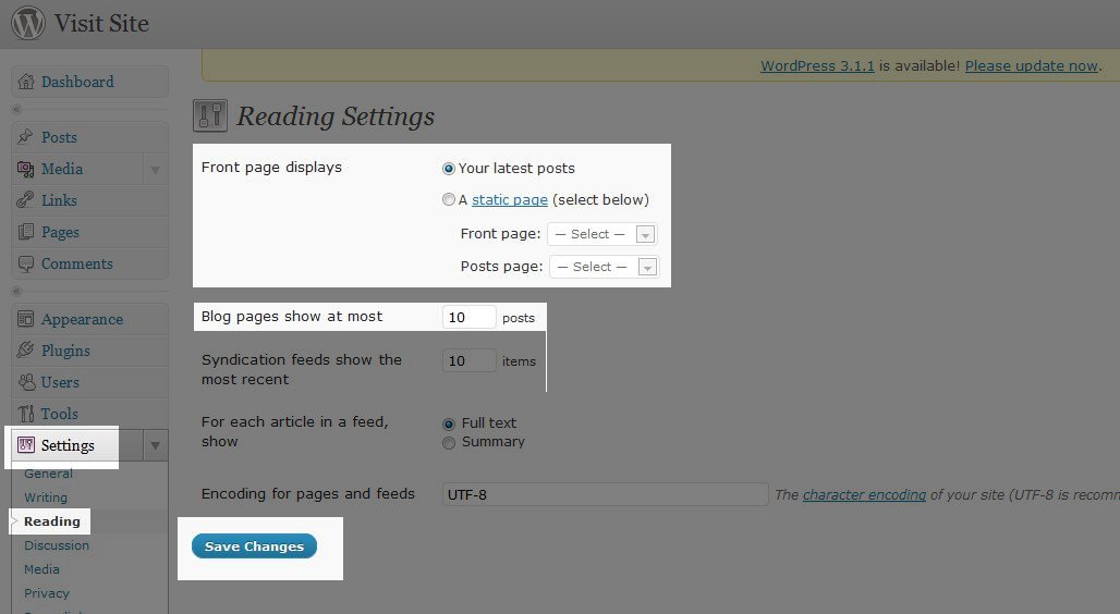 On the "Reading" sub menu you will see different changes you can make to your site.