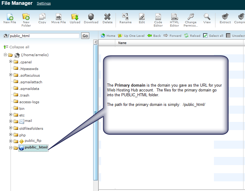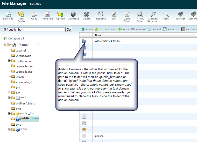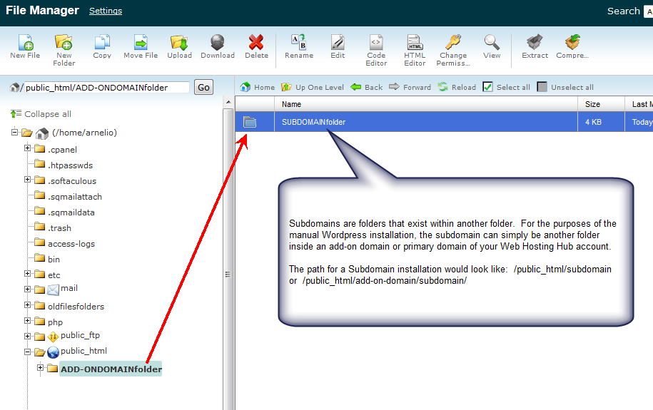 - If you are using an add-on domain, then create your add-on domain before proceeding. For more information on creating add-on domains, please go to How to Add an Add-on Domain. If you need to add a subdomain, you can do so by simply creating a new folder in the public_html folder or within the folder of a new add-on domain. Here's how the folder structure would appear for each possible type of installation (primary domain, add-on domain, and subdomain installations) in the Cpanel File Manager.: