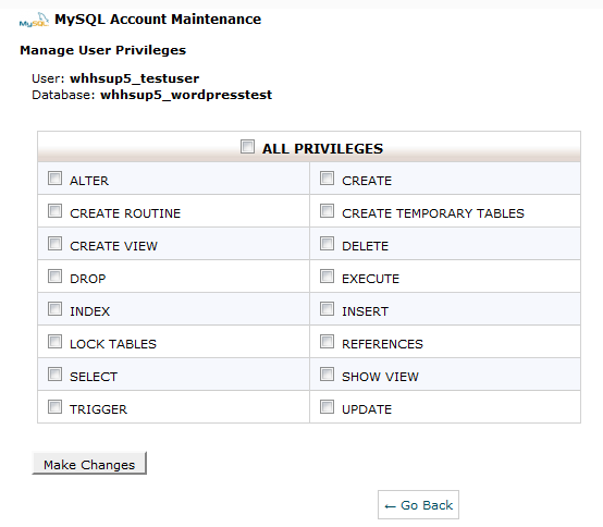 - Select the option labeled ALL PRIVILEGES by left-clicking in the checkbox, then click on the button in the bottom left-hand corner labeled MAKE CHANGES.