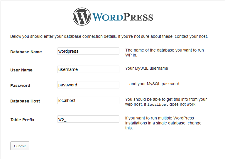 - The first needed is the information listed in the previous screen - the database information. If your database server is in the same location as your web server, then the database host setting will be LOCALHOST. Here's a screenshot of the database settings: