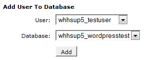 - The next step in the database process is to ASSIGN the user you have created to the database that you have created. Right below the create user dialog window is the section to ADD USER TO DATABASE. Click on the drop-down arrow for the user and select the user you just created from the list. After you have found the user you created, click on drop-down menu for the database and then select the name of the database that you just created. It will appear similar to the following screenshot: