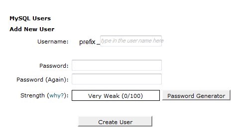 Note that for every Web Hosting Hub installation, the database and user name will be prefixed by the user Cpanel user name.
