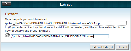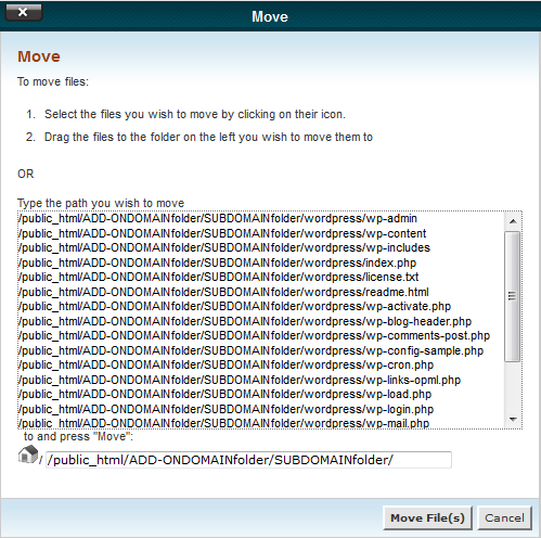 When the dialog first opens the folder "wordpress" will still be in the path listed at the bottom. You can click on this field and change it so that you designate the proper target for where the files will actually moved. In the example above, "wordpress" was removed from the path leaving the path as: /public_html/ADD-ONDOMAINfolder/SUBDOMAINfolder/. The files will be moved into the SUBDOMAINfolder.