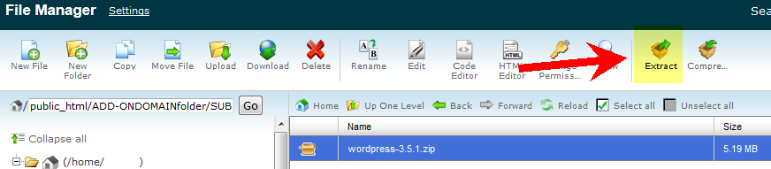 - Select the Wordpress installation file in order to highlight it, then click on EXTRACT in the top right section of the File Manager interface.