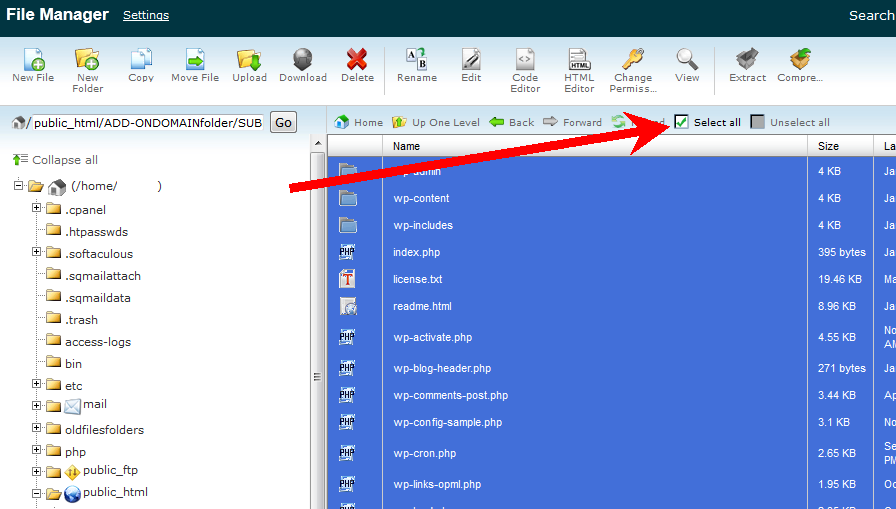 - Click on a single file or folder in the file list in the right-window pane, then click on the SELECT ALL in the File Manager as per below: