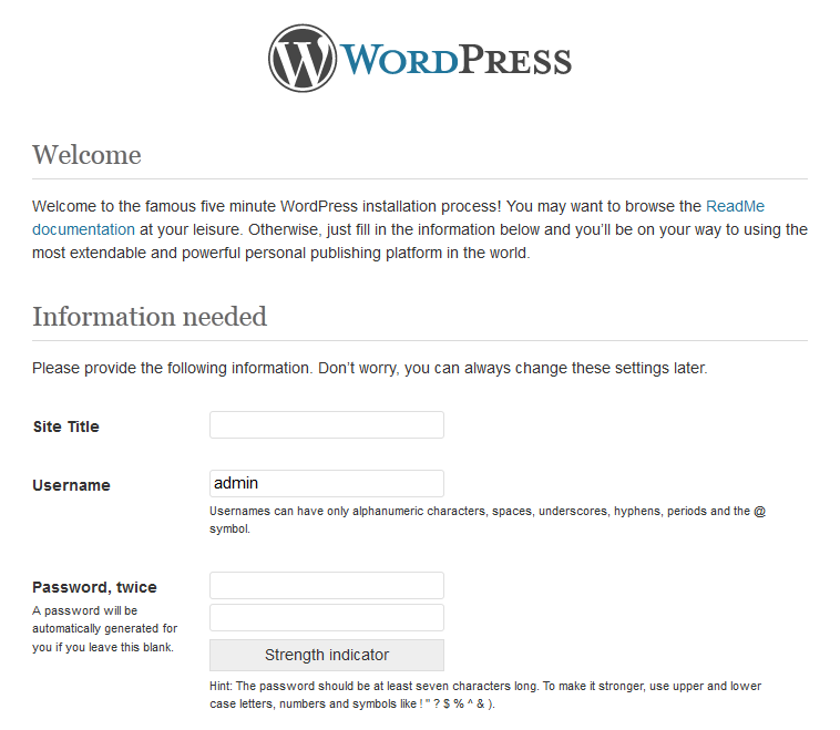 Fill in the Site Title, User name and Password then scroll down to complete the form.