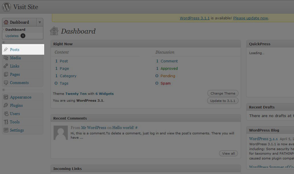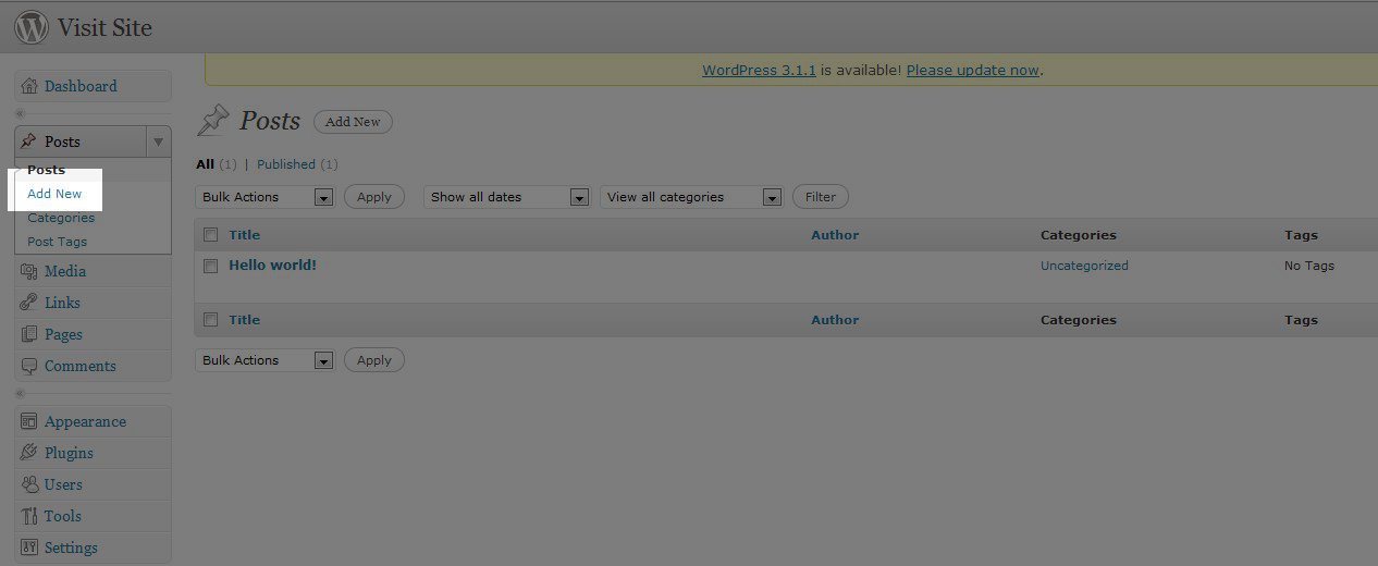 This will display a list of any posts currently on your site as well as a new sub-menu. When you install WordPress, there is one blog post already made, called "Hello World!". Click on "Add New" under "Posts" to add your own blog post: