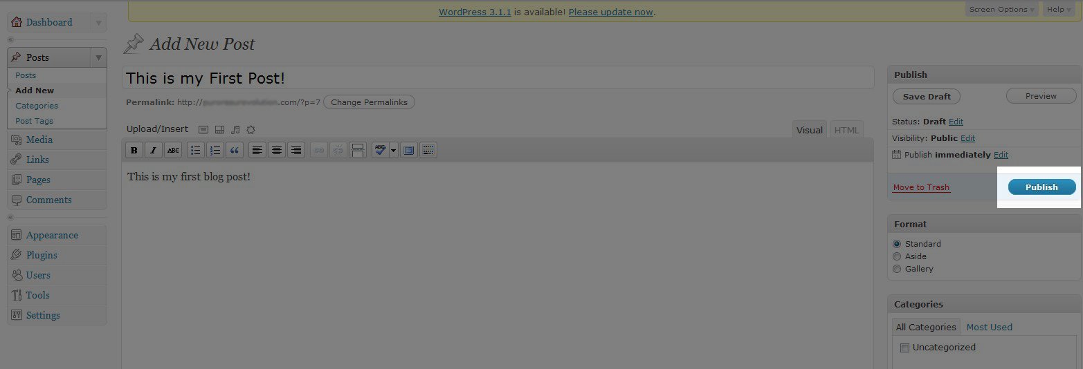 This will bring up a page where you can make your new post, called the Editor. The Editor works similar to that in a word processor as you can use bold, underline, and other effects. Also don't forget to include a Title to your post. Once you are done, click on "Publish":