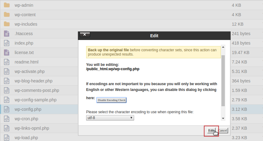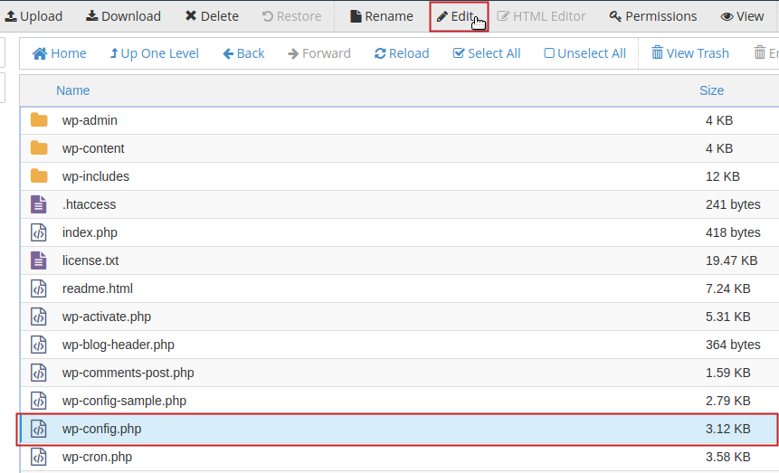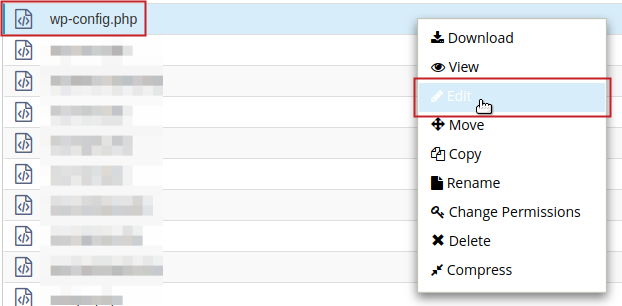 Alternatively you can simply left-click on the wp-config.php file and click on Edit from the toolbar above.