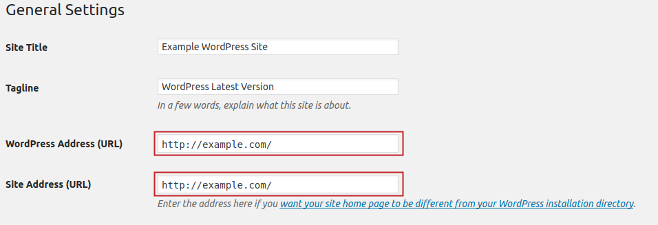 Under the General Settings section, enter the new URL in the WordPress Address (URL) and Site Address (URL) fields.