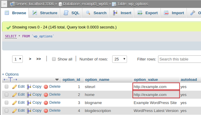 Find siteurl and home under the option_name column. Under the option_value column, double-click next to each entry and enter the new URL you want to use for your website. Your changes will save automatically once you click out of the boxes you edit. You can simply close the window to exit out of phpMyAdmin.