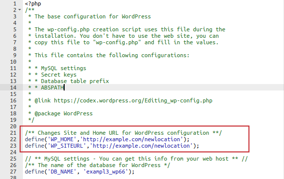 define('WP_HOME','http://example.com/newlocation');