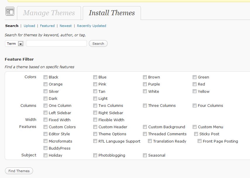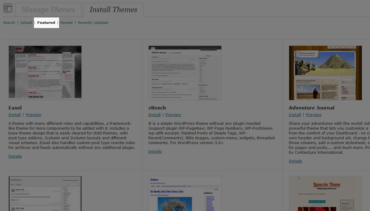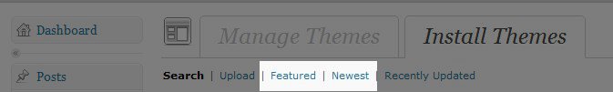 On the Install Themes tab, there are a few different ways to find a new theme. First, we recommend clicking on the "Featured" and "Newest" links as this will show you some of the most popular and up to date themes available.