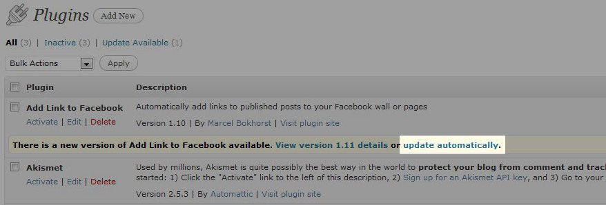 - On the Plugins page, you will see a message similar to "There is a new version of....." to let you know which plugin needs an update. As you can see below, the Facebook Plugin I installed earlier in this section is ready for an update.