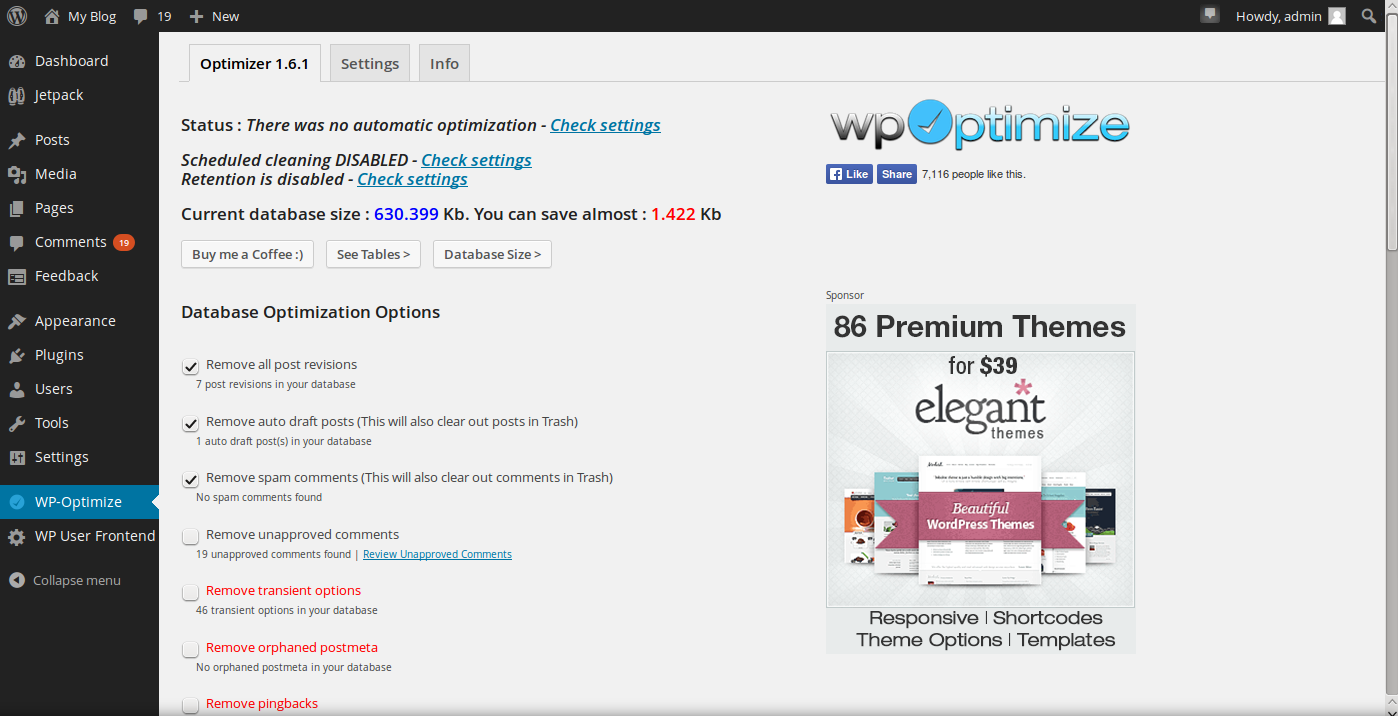 Once you have selected your desired options here, click on by blue Process button. The WP-Optimize plugin will then clean up and optimize your database for you.