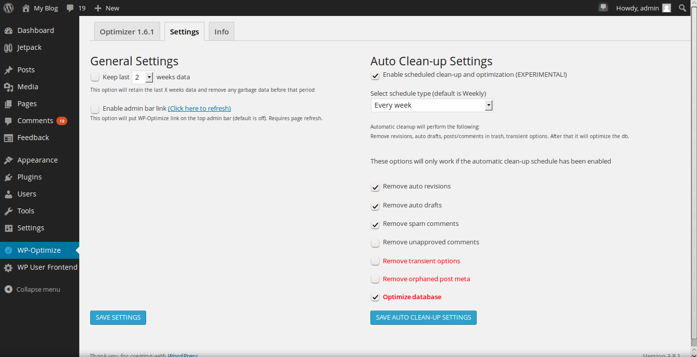 To set the WP-Optimize plugin to automatically optimize your WordPress database, click the WP-Optimize menu item, then the Settings tab up top. Here you will see options to the right which will allow you to set up automatic optimization. To turn it on, click the checkbox for Enable scheduled clean-up and optimization, then click Save auto clean-up settings.