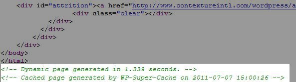 There are two ways to confirm that WP Super Cache installed correctly. First, you can check the source code of your site. The source code will show if the webpage was successfully cached. In FireFox, right click on any page within your WordPress website and select View Page Source. Other Internet browsers have the same option as well. At the bottom of the page, if WP Super Cache was installed you will see this:
