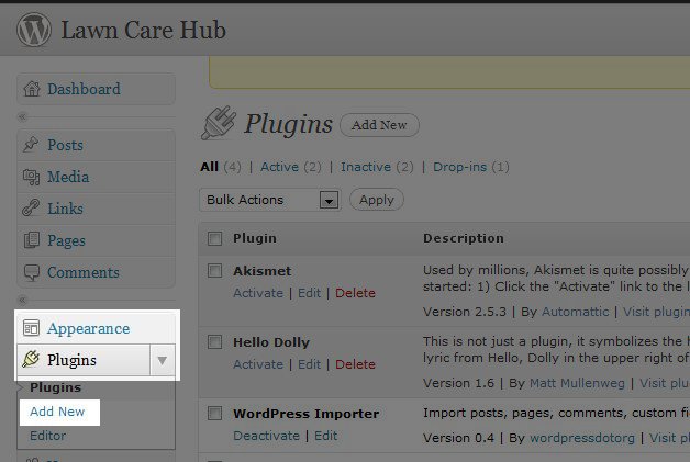 Begin by logging into your WordPress Dashboard, click on Plugins on the left menu and then Add New: