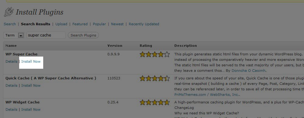 After the search is finished look on the results for "WP Super Cache." Once you have located the plugin click on Install Now under the plugin: