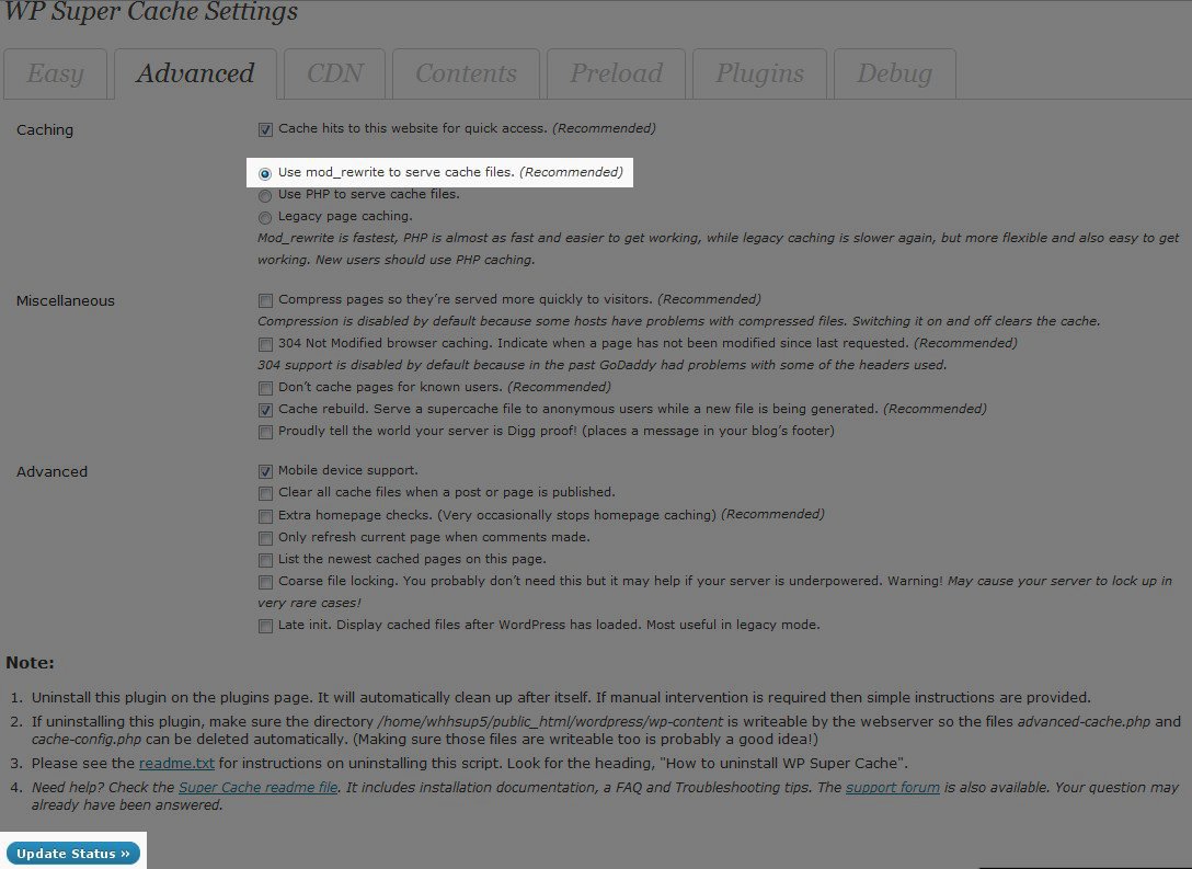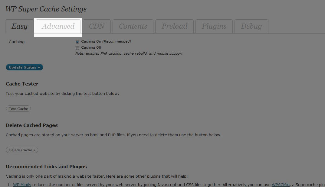 There are still a few more steps to optimize WP Super Cache. On the same screen click on the Advanced tab. Here you will have access to the following options.•Caching – Here you can enable and disable caching with a check box. •Cache Delivery Method – Choose between Simple and Expert caching. •Miscellaneous – This section allows you to set cache restrictions by enabling and disabling cache for users that are logged in or have a cookie set in their browser. You can also set whether you want to compress pages or cache HTTP headers. •Advanced – One of the most important settings here is the ability to clear cache when content is updated or published. Some of the settings here require additional plugins. An example of this is covered in our article on How to Cache Mobile pages with the WordPress Super Cache and WPTouch Plugin. I recommend following the provided FAQ links for more information. •Cache Location – Here you can set a specific path to store your site cache. Cached content will be moved automatically if you change this setting.