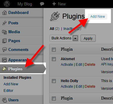 - Click the Plugins link on the menu bar, then click the Add New link.