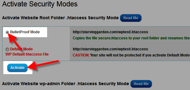 - Under the next section titled "Activate Website wp-admin Folder .htaccess Security Mode" Click the BulletProof Mode option, then click the Activate button below.