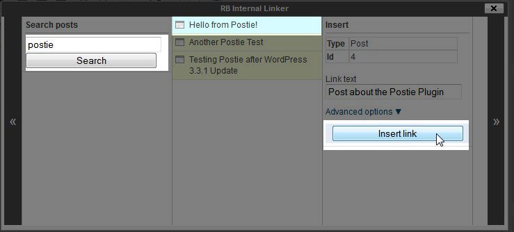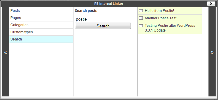When you click the RB Internal Links button, it pulls up the RB Internal Linker window where you will choose the Post, Page, Category (or even Custom Type) that you want to link to.
