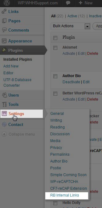 Once you have installed the RB Internal Links plugin, a new option for RB Internal Links will be available under WordPress > Settings. Click on this to view (and change if you want) the RB Internal Links settings.