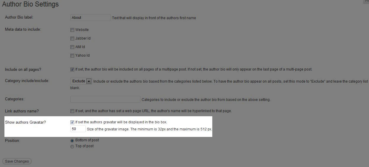 After we've installed our plugin, we'll want to navigate to the settings for this plugin (Settings > Author Bio). There are several settings you can adjust here, but for this example we want to make sure the option to "Show authors Gravatar" is selected. Feel free to try different settings and test them out on your site to find what works best for you.