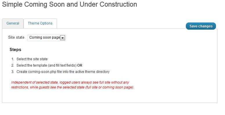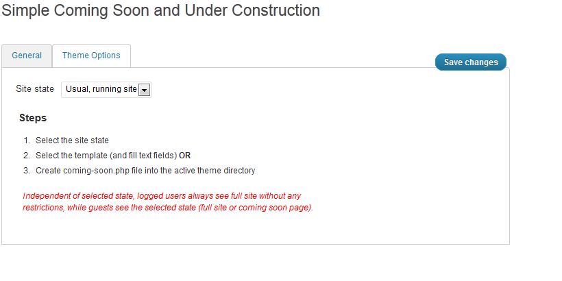 Once we've got our site ready to go we can then go back to our Simple Coming Soon Settings in the dashboard, change the Site state to "Usual, running site" and click the Save button to save our changes. Now our visitors will see the full site instead of the an under construction page. If you need more information on creating an under construction page. please go to the How to create an Under Construction page Under Construction page.
