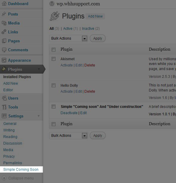 Next we'll edit the settings for the plugin by selecting Settings > Simple Coming Soon in our WordPress dashboard: