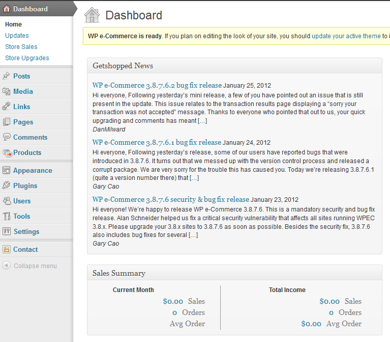 Once you have installed and activated the WP e-Commerce plugin you will notice a few changes to your WordPress dashboard: