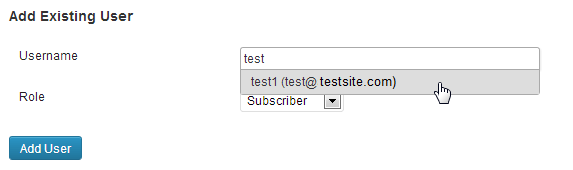 If you want to add a user that is already in the database from your other Wordpress sites, you can start typing in the name in the USER NAME field of the ADD EXISTING USER. The name(s) closest to what you typed should appear.