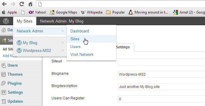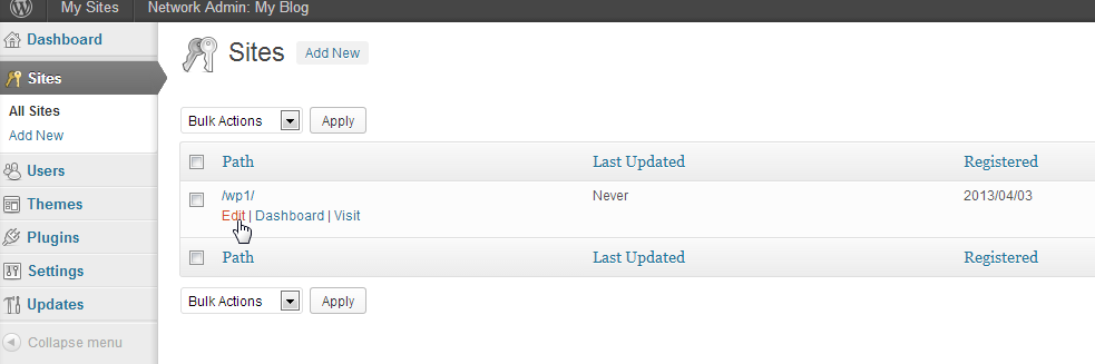 Hover over the top menu bar where it says My Sites. You will see Network Admin appear in the drop-down menu. Click on SITES in the menu that pops up on the right. When you click on sites, you will see a table listing all of the locations (called Paths) for your networked WordPress sites. Scroll down and then hover the networked WordPress installation that you wish to edit.